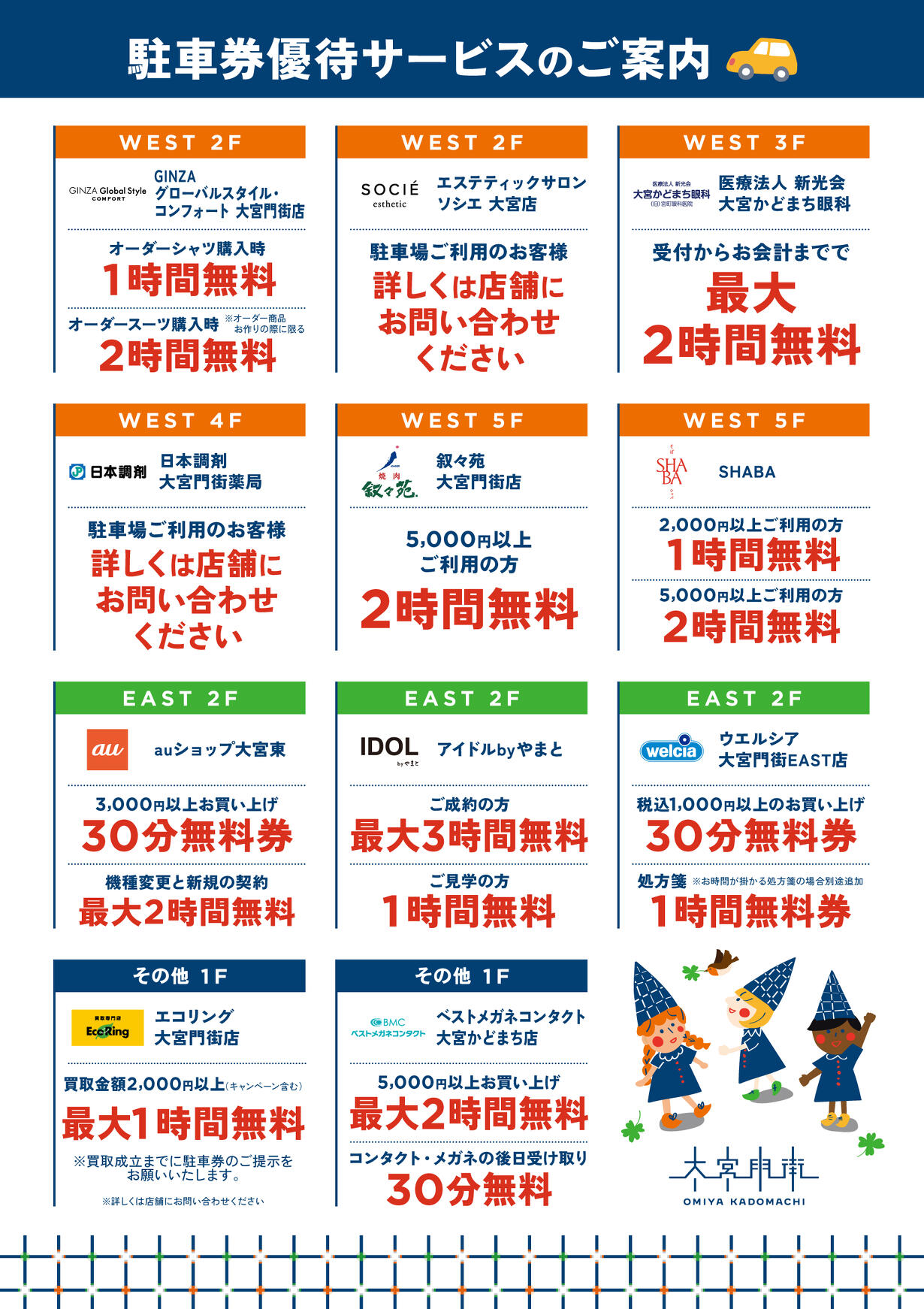 2025-08-05 その他 駐車場利用料優待サービスのご案内 駐車場利用料やご利用方法などの詳細は、こちらから この記事をシェアする ポストする シェアする LINEで送る URLをコピー 前の記事 次の記事 イベント&ニュースへ戻る Other News 同じカテゴリのニュース 2026-02-03 営業時間・定休日のご案内 その他 2025-08-05 駐車場利用料優待サービスのご案内 その他 2025-05-07 【大宮門街EW】お買物券・お食事券・LINEクーポン、ご利用のご案内 その他 イベント&ニュースをもっと見る