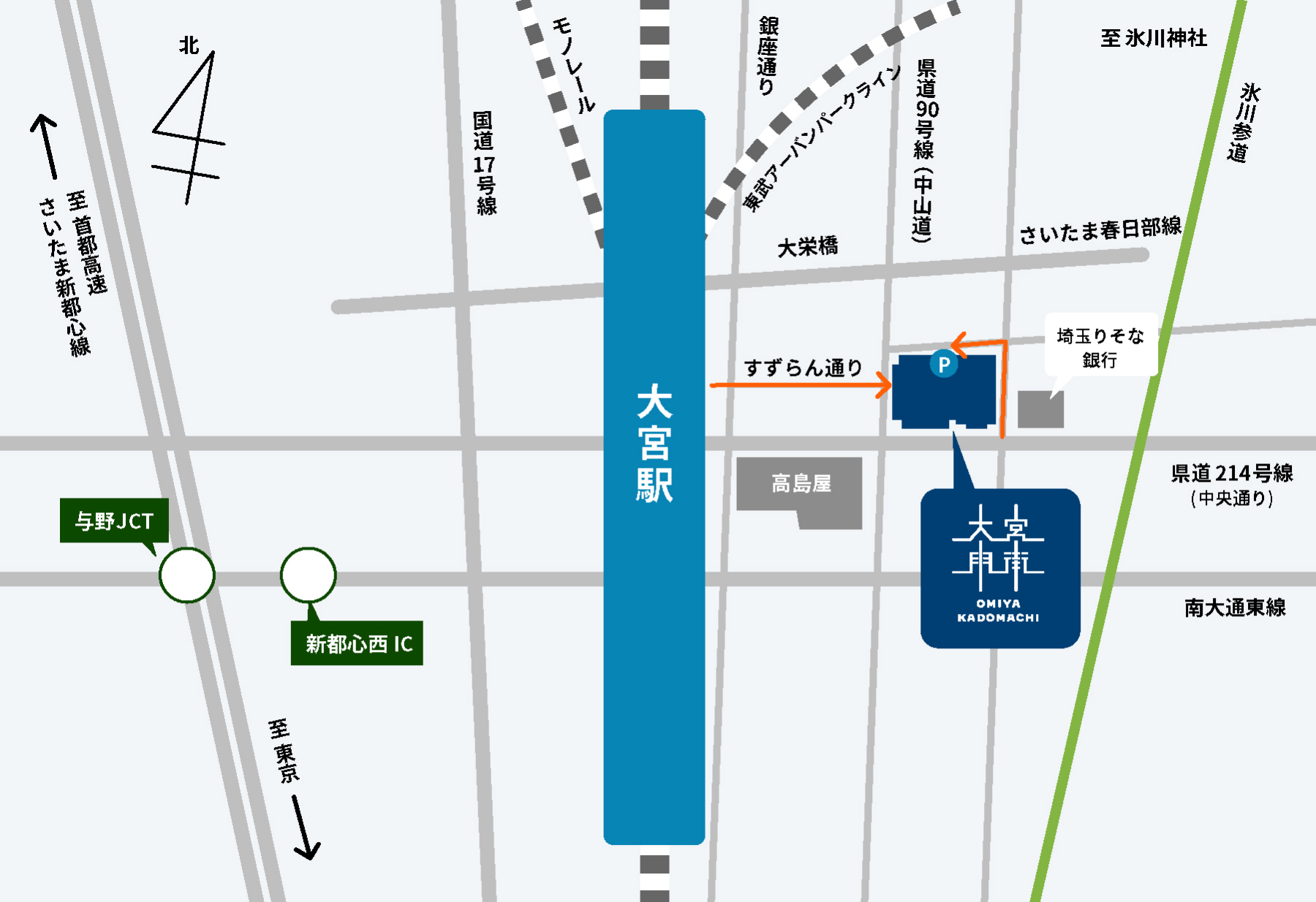 高速大宮線新都心西口出口より1.1km、東北自動車道岩槻インターより7.5km