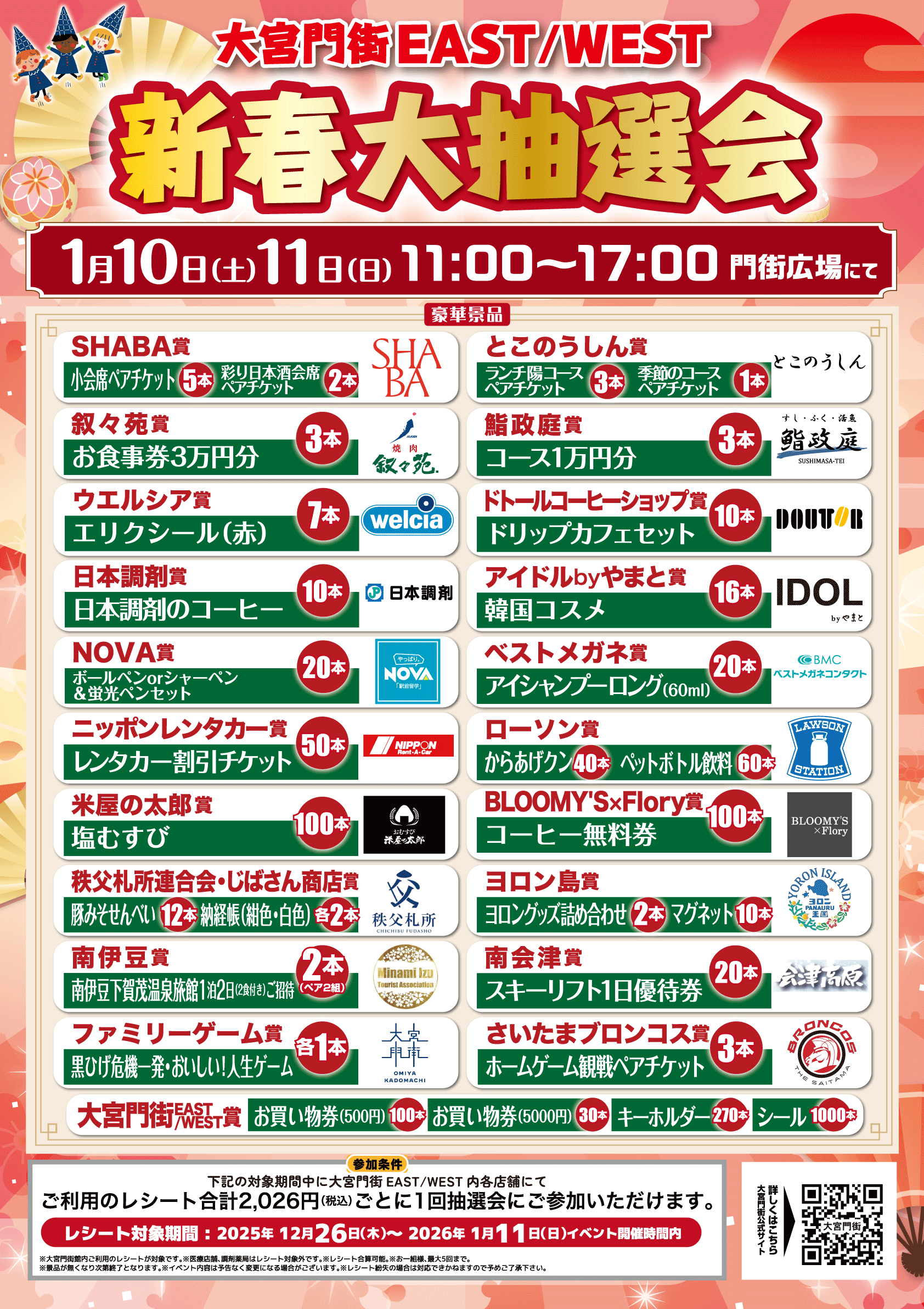 【参加条件】上記レシート対象期間中の大宮門街EAST/WEST内各店舗にてご利用のレシート合計2,026円ごとに1回、1回の抽選につき最大5回までご参加いただけます。