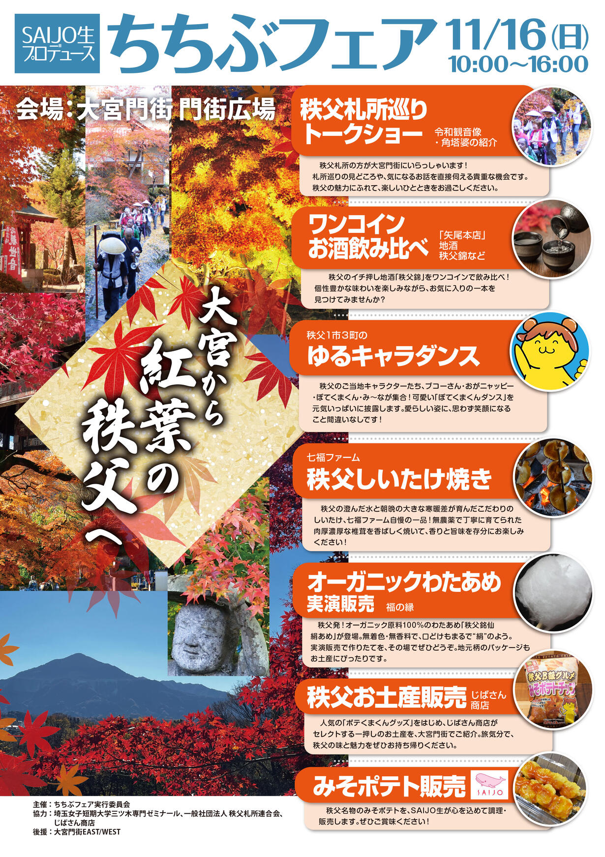 2025-11-06 イベント 【門街広場】ちちぶフェア 開催決定! 【日付】2025年11月16日(日) 【時間】10:00~16:00 【会場】大宮門街 1階 門街広場 秩父の魅力をまるごと楽しめる「ちちぶフェア」を開催! 札所巡りのトークショーや、秩父の地酒飲み比べ、ポテくまくんたちによるダンスステージなど、楽しいコンテンツが盛りだくさん。 しいたけ焼きやみそポテトなどのご当地グルメ、人気のお土産販売も登場します。 秩父の味と文化をたっぷり感じられるイベントに、ぜひお立ち寄りください! この記事をシェアする ポストする シェアする LINEで送る URLをコピー 前の記事 イベント&ニュースへ戻る Other News 同じカテゴリのニュース 2025-11-06 【門街広場】ちちぶフェア 開催決定! イベント 2025-11-03 【門街広場】ハイハイチャンピオンシップレース 開催決定! イベント 2025-09-27 さいたまブロンコス シーズン開幕記念コラボキャンペーン 開催! イベント イベント&ニュースをもっと見る