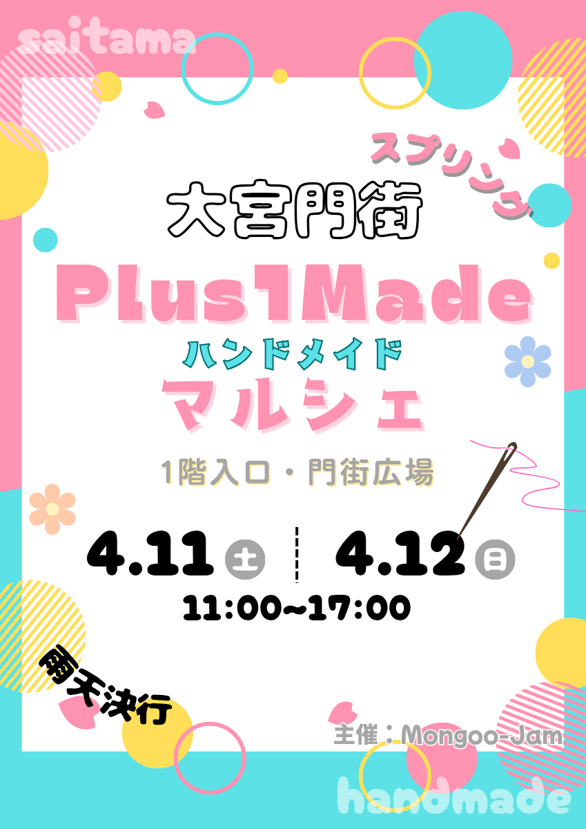2026-03-17 イベント 【門街広場】ハンドメイドイベント Plus1Madeマルシェ 開催決定! 【日付】4月11日(土)・12日(日) 【時間】11:00~17:00 ハンドメイドイベントのPlus1Madeマルシェが今年も開催です! ハンドメイド作家の想いが詰まった作品たちが、皆さまとの出会いを心待ちにしています✨ 皆様お誘いあわせのうえ、ぜひ遊びに来てください🌸 この記事をシェアする ポストする シェアする LINEで送る URLをコピー 前の記事 イベント&ニュースへ戻る Other News 同じカテゴリのニュース 2026-03-17 【門街広場】ハンドメイドイベント Plus1Madeマルシェ 開催決定! イベント 2026-02-05 【門街広場】カドマチフラダンスステージ 出場チーム募集のお知らせ イベント 2025-09-27 さいたまブロンコス シーズン開幕記念コラボキャンペーン 開催! イベント イベント&ニュースをもっと見る