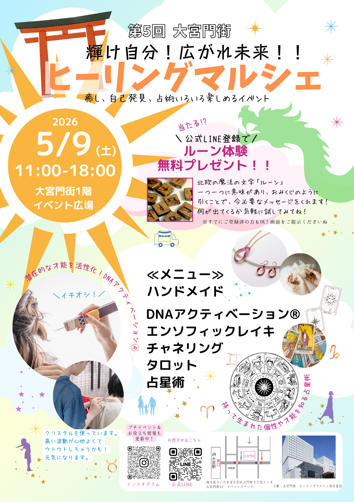 2026-04-03 イベント 【門街広場】ヒーリングマルシェ 開催決定! 第5回 大宮門街 ヒーリングマルシェ 【日時】5月9日(土) 11:00~18:00 【会場】大宮門街1階 門街広場 皆様お誘いあわせのうえ、ぜひ遊びに来てくださいね♪ この記事をシェアする ポストする シェアする LINEで送る URLをコピー 前の記事 イベント&ニュースへ戻る Other News 同じカテゴリのニュース 2026-04-03 【門街広場】ヒーリングマルシェ 開催決定! イベント 2026-03-17 【門街広場】ハンドメイドイベント Plus1Madeマルシェ 開催決定! イベント 2026-02-05 【門街広場】カドマチフラダンスステージ 出場チーム募集のお知らせ イベント イベント&ニュースをもっと見る